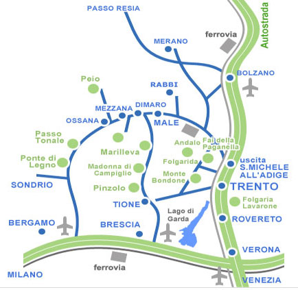 Odległość do Folgarida-Marilleva do lotnisk wynosi: 99km do lotniska Bolzano ,150 km do lotniska Bergamo 160km do lotniska Werona Villafranca, 240km od lotniska Wenecji.