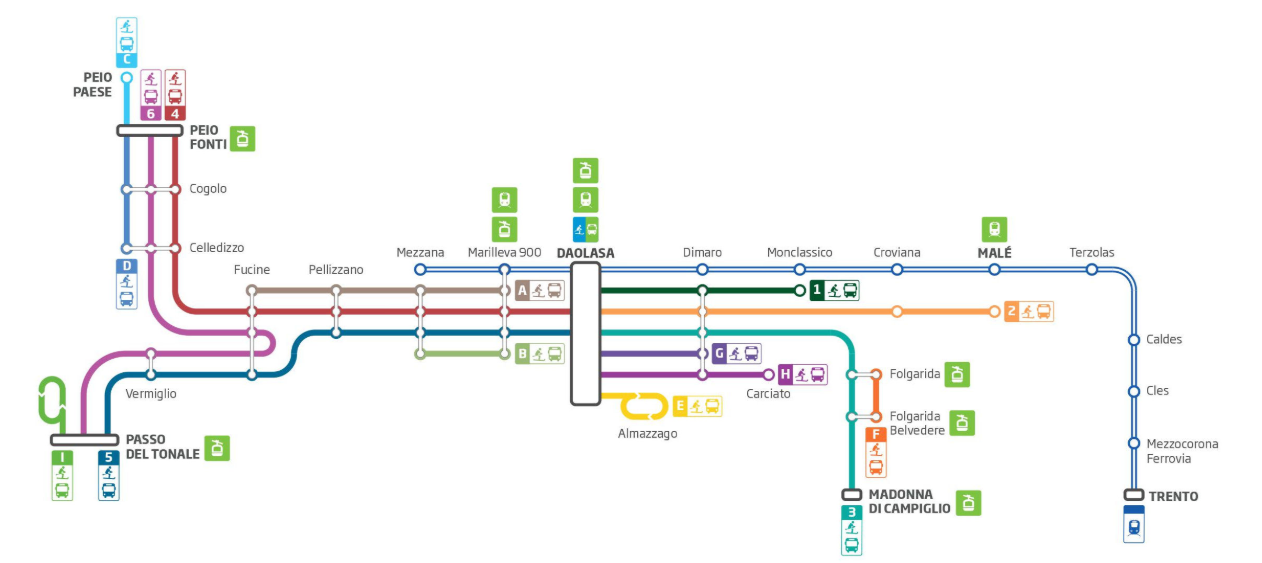 Dodatkowo dla posiadaczy biletów Lini Dolomiti Express parkingi przy Dworcu Kolejowym w Trydencie-Male-Marilleva są bezpłatne. Linia kolejowa, zapewnia nam komfortowy dojazd do wielu miejscowości.Rozkład dostosowant jest zawsze pod sezon narciarski.Więcej informacji i tabele rozkładów znajdziemy poniżej.